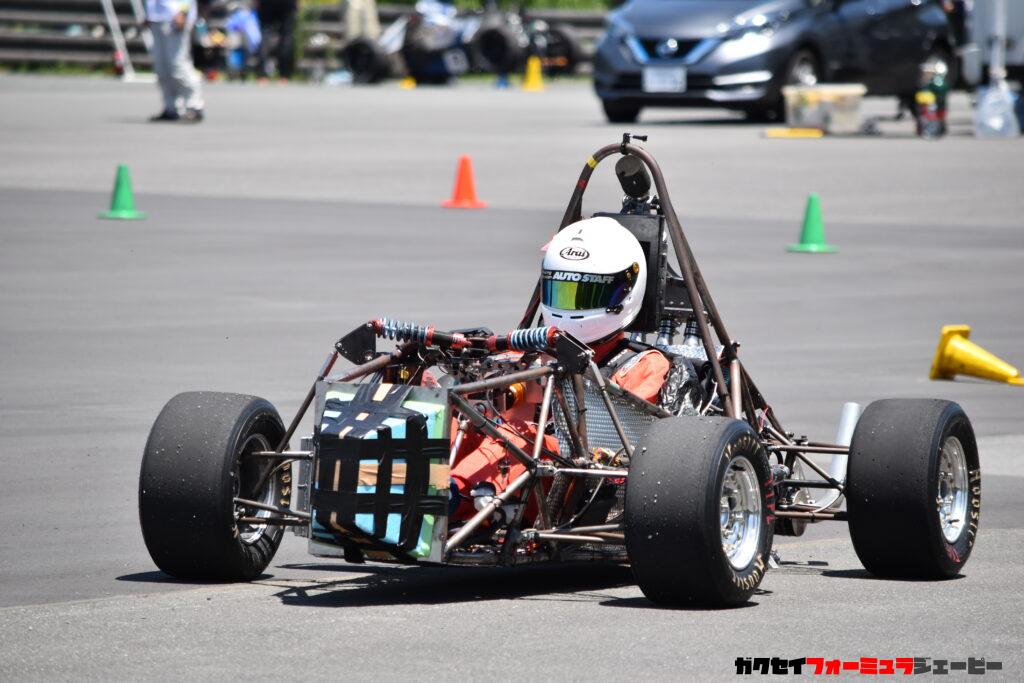 そして春、マシンのシェイクダウンにこぎつけます。この時は見かけはホネホネスカスカ、古いマシンからパーツを流用したりしながらも、マシンの初走行を行います。学生フォーミュラではマシンのトラブル出しだったり、実走行でのパーツテストが重要になるので、少しでも長い期間テストをしよう我先に走行を始めます。